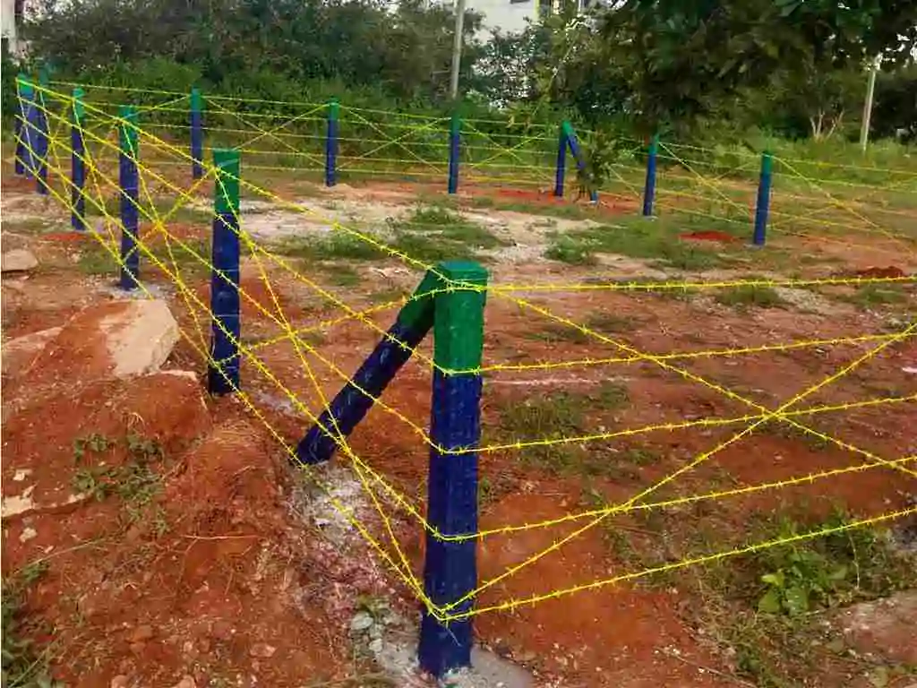 Barbed wire fencing is the most cost effective way of protecting your property. At IndiaProp, we use a strong, high quality form of barbed wire that is PVC coated and rust resistant. Our pattern for fencing aims to prevent encroachments as well as stray animals getting into the property. For this, we use an effective design with 5 horizontal lines and 2 crossed diagonals . Poles are necessary to support the fencing. We stand up poles that are 7 feet high (with 2 feet going under the ground and 5 feet above ground). The poles are spaced 10 feet apart for most effective support. The life of this is typically 5+ years. An optional gate, 3 ft x 5ft for access can be optionally installed